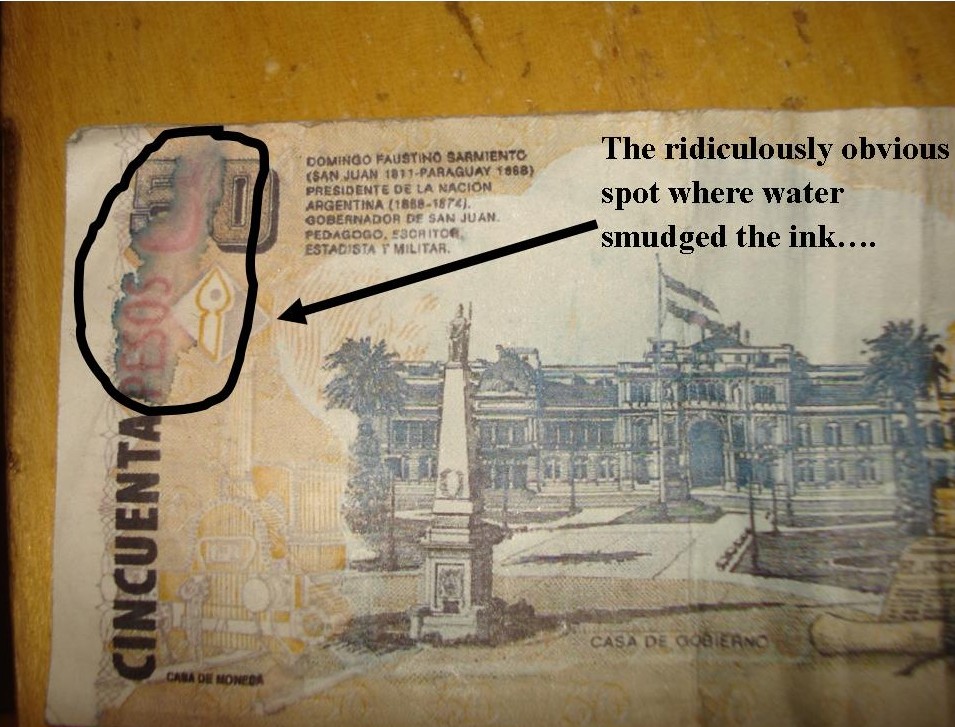 So, before I got here to Buenos Aires, practically every person who had ever spent any time here before told me to be careful of the cab drivers because they are notorious for slipping you fake bills. Well, a couple weeks in, don’t you know I get one. The guy was so nice and friendly too. This is a 50 peso note, or about $13 US. I almost spent it, but then I felt so bad pawning it off on someone else, I told the waiter to hold on and gave him smaller change. Ha. So I guess this just will be my Argentina souvenir…