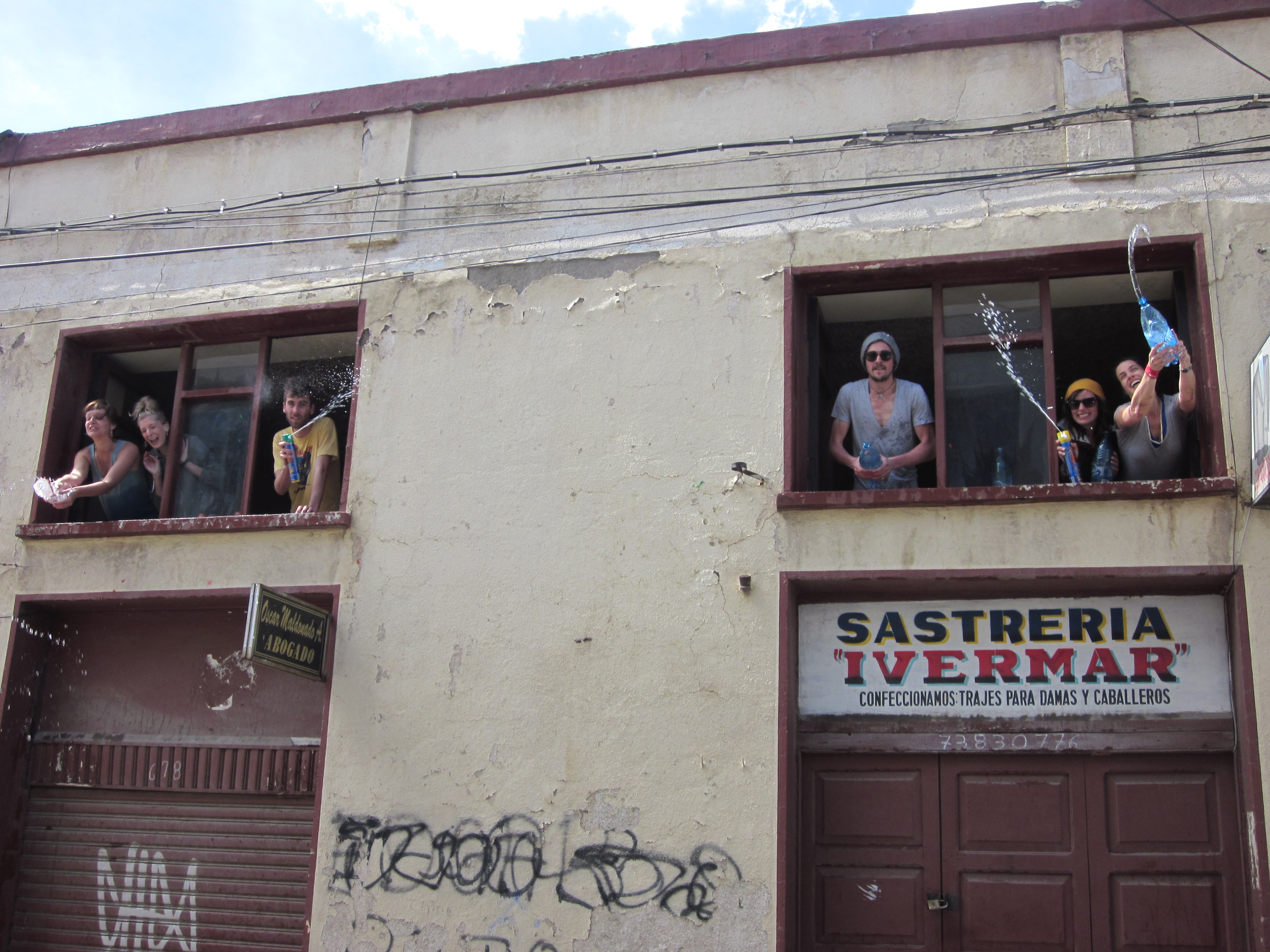 Our second story rented rooms provided the perfect base for mounting our counter attack. Francisco had the fantastic idea of filling empty 2 liter bottles with water and, much like the medieval warriors defending a castle pouring out pots of boiling oil, dumping this water on the heads of unsuspecting passer byres. But before you are too quick to judge-we were very discriminating in who we aimed for, only going for the people-who-looked-like-they-deserved-it. Meaning, they were carrying multiple spray cans or a bag of water balloons etc, taking especially delight in getting those same types of teenage boys who had been singling us out all weekend.