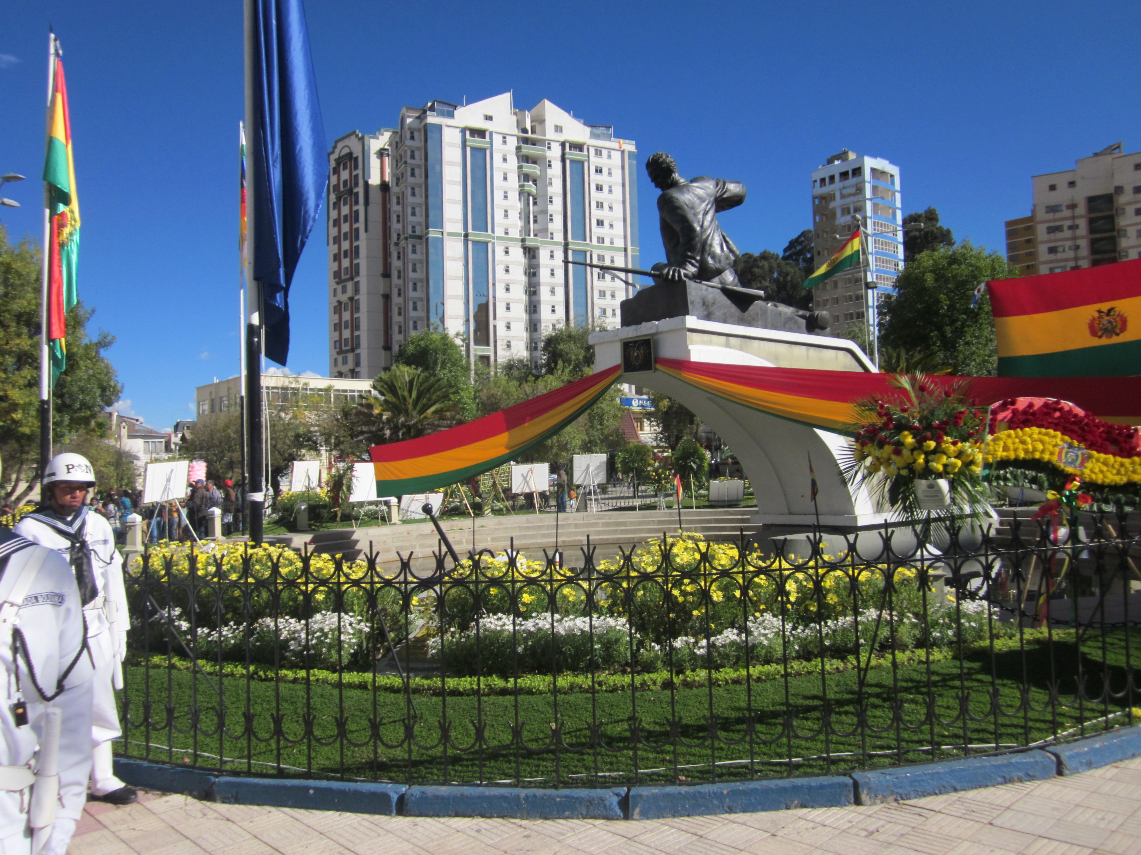 In the plaza by my house is an extremely large statue of a man, Eduardo Avaroa. He is a Bolivian military leader. But unlike most other countries, that put their war heroes in gallant poses- on top large warhorses, swords extended, showing how they will conquer all foes- Eduardo Avaroa is fallen to the ground, his rife laying on the ground.