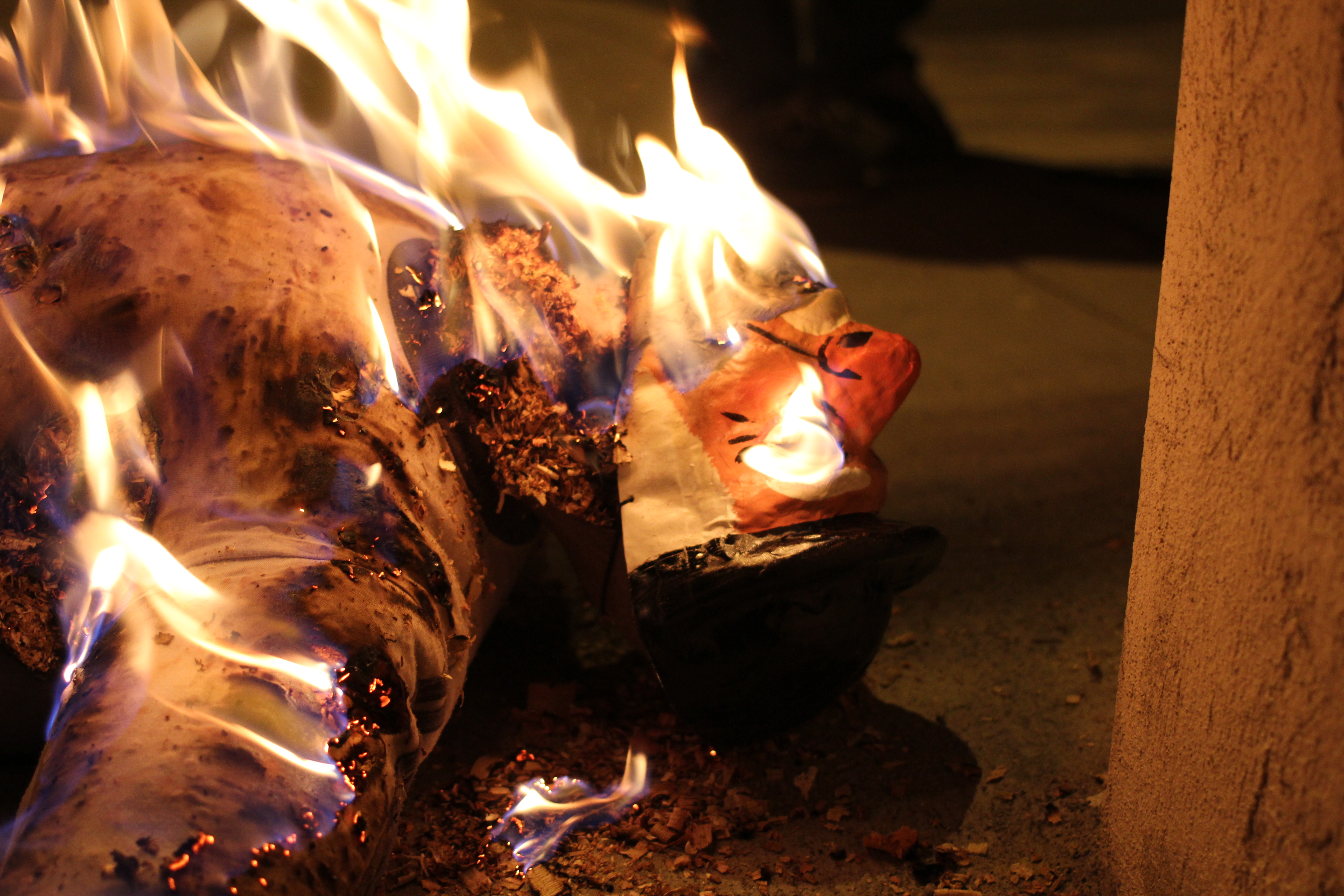 Then finally comes the moment. If you’ve had a particularly bad year, you give him 3 patazos (big kicks) before lighting him on fire. I have now learned that the papermachine viejos are easy to light….but sawdust not so much. Our guy, Edguardo as I decided to name him, was looking like a horrible burn victim before we finally got the lighter fluid out and were able to get a good flame going.