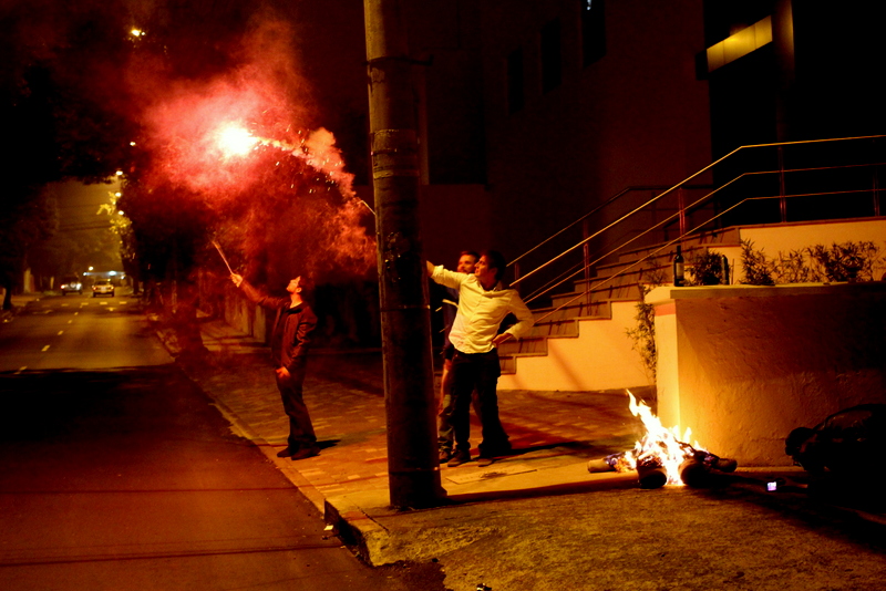 One of the more particular Ecuadorian traditions is the idea of getting rid of all the bad things of the old year…and what better way to do that than burning an effigy of the old year. In the form of a Viejo –or an old man. Traditionally you take your old clothes and stuff them with sawdust (and often fireworks) to be set on fire right at the stroke of midnight (which seems like its getting quite busy with all the grape eating and suitcase walking, but somehow you have to fit it all in).