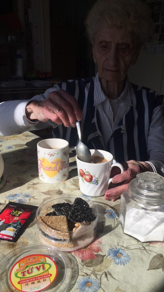 My grandma grew up in NYC, back when the Italians and the Irish still hated each other, and it really mattered if you lived on the German or Polish block. She tells stories of roasting potatoes on election night in street bonfires, and how they had to put cardboard in their shoes when they wore holes through the soles during the depression. But, “everyone was in the same boat, so we didn’t know any different.” She watched her mother die a terrible death from cancer, but was still strong enough at 12 years old to make a huge scene when a man tried to put his hand up the dress her little cousin at the movie theater. She still uses that same strength and determination today to resist efforts to infantilize her, as is so common with the elderly.